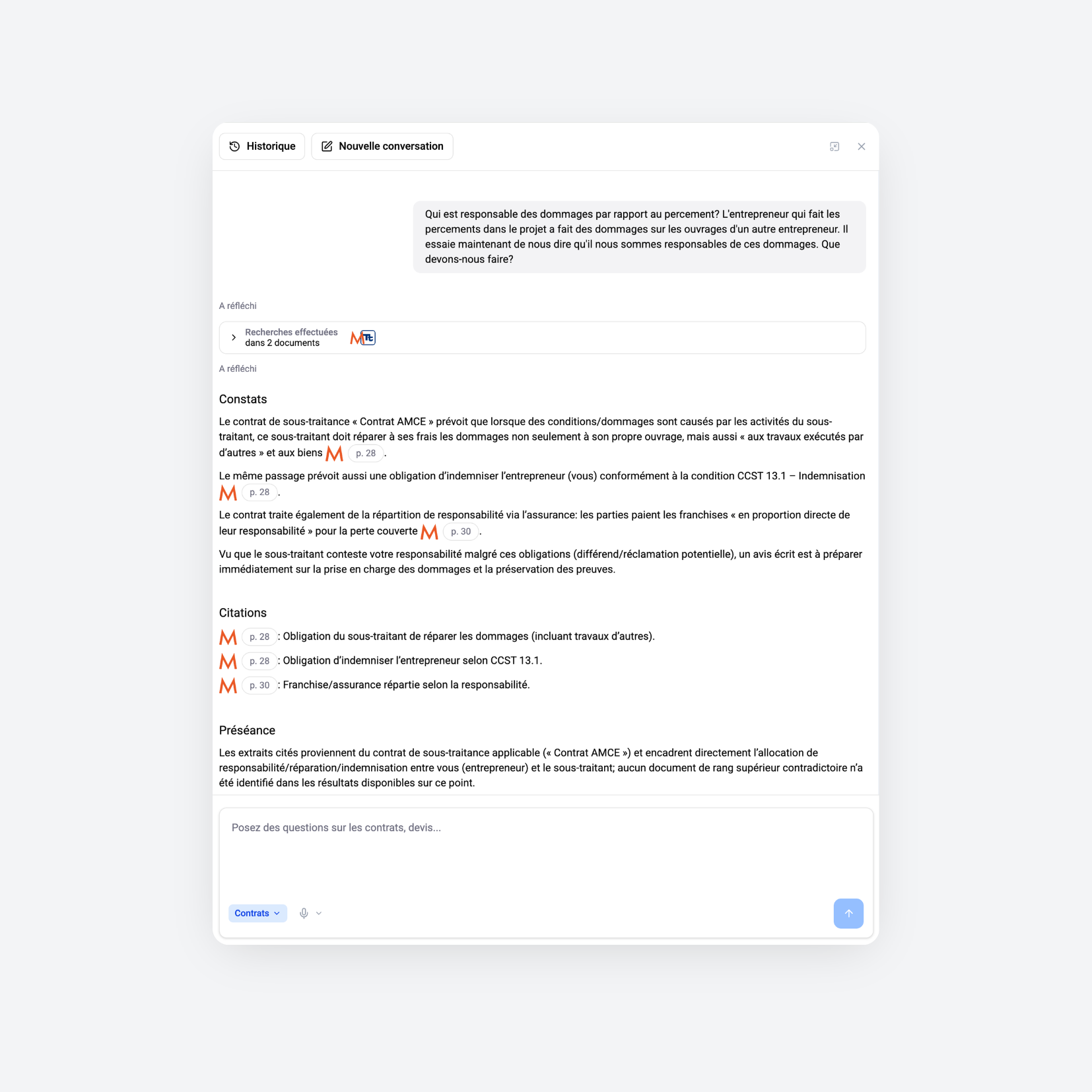 Trouvez la bonne clause en secondes, pas en heures. Recherche en langage naturel dans tous vos documents, surlignage automatique des citations et résolution de la préséance documentaire.